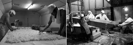 「もろみ」をひとつひとつ、人の手で袋詰めし、丹念に積み重ねて、上からゆっくりと圧をかけてお酒を搾るのです。余分な雑味が出ないようにするため、一回めはもろみ自身の重さで、その後、徐々に圧力を加え、3~4日間かけてゆっくりと搾っていきます。